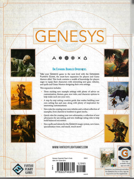 Dive into a world of adventure with the Expanded Player's Guide for Genesys Roleplaying!The Expanded Player's Guide contains a wealth of knowledge for players eager to equip their characters with interesting new gear, vehicles, and spells and Game Masters designing their own settings. This is the first expansion book that is for Genesys as a whole, rather than focusing on a specific setting. This 112-page book features three exciting new example settings, a step-by-step guide that makes creating your own settings easier than ever, new rules for creating your own vehicles, quick rules for creating your own adversaries, and new spells and talents for the Genesys Magic System to further customize your games.