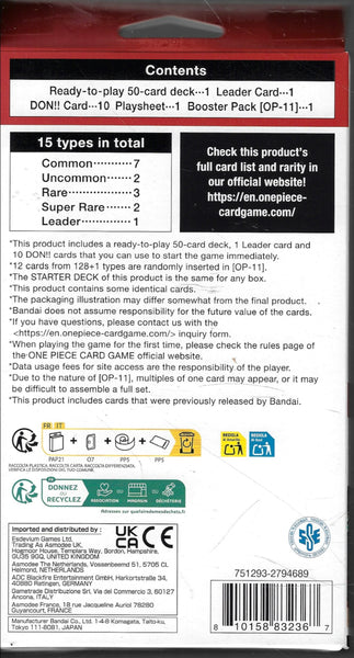 This is the best timing for newcomers to start ONE PIECE CARD GAME. The six colors of Starter Decks are from previous series. Simple Leader effects and color characteristics make this an ideal product for newcomers! Each deck contains 5 cards with new text. Add these 5 new cards to an existing battle style and evolve your strategy! Includes 1 OP-11 pack, featuring reprints of popular cards from past packs. Even newcomers can strengthen their decks and enhance their ONE PIECE CARD GAME experience!