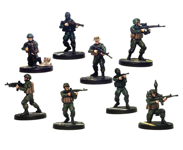 Box contains 8 plastic miniatures and 20 game cards, Spec Ops rules booklet, plastic bases and assembly leaflet.